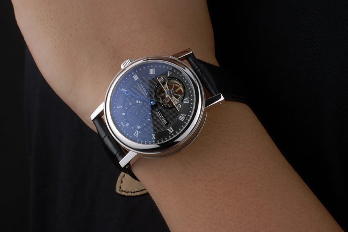 Bracelet en acier: Breguet en relief crocodile noir bracelet en cuir de chaleur avec gravé Brequet acier inoxydable poli pli en crochet boucle clasp