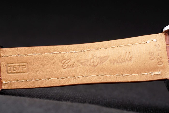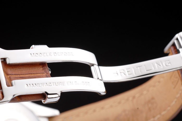 Bracelet en acier inoxydable: Brown bracelet en cuir de crocodile avec brevet coutures blanches et de la chaleur en relief gravures Breitling et en acier inoxydable gravé replient déployante avec logo Breitling sur top