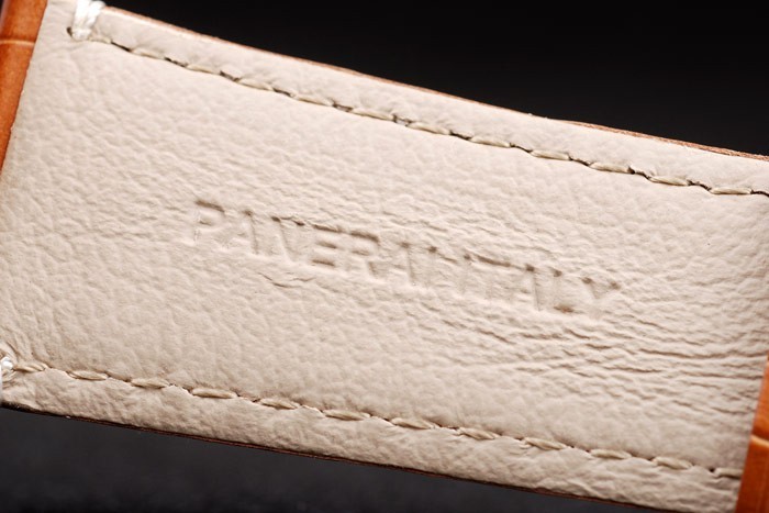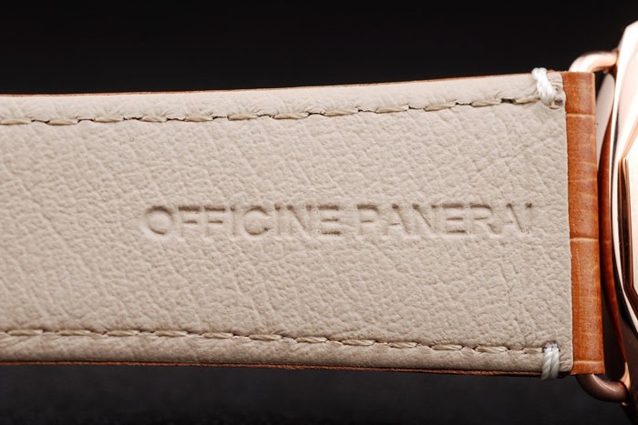 Bracelet: Brown bracelet en cuir de crocodile avec coutures blanches et chaleur gaufré Officine Panerai Italie timbre et 18k or rose plaqué crochet boucle déployante avec Panerai engraving