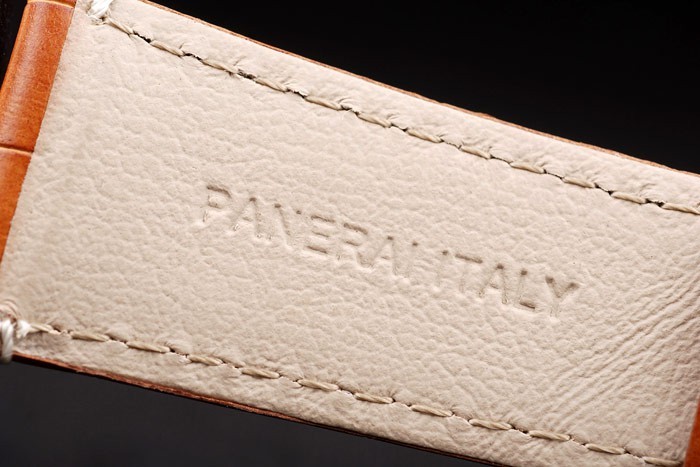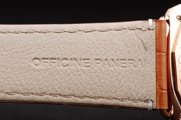 Bracelet: Brown bracelet en cuir de crocodile avec coutures blanches et chaleur gaufré Officine Panerai Italie timbre et 18k or rose plaqué crochet boucle déployante avec Panerai engraving